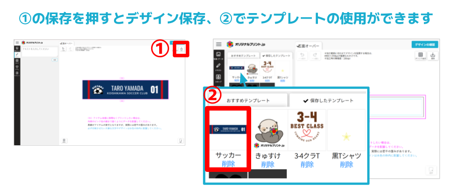 共通デザインのタオルで、背番号や名前などを変更したい場合は、デザインツールの「テンプレート保存」機能を使うと便利です。元のデザインをテンプレートとして保存すれば、名前や背番号を簡単に変えながら、チーム全員分を効率的に作成できます。