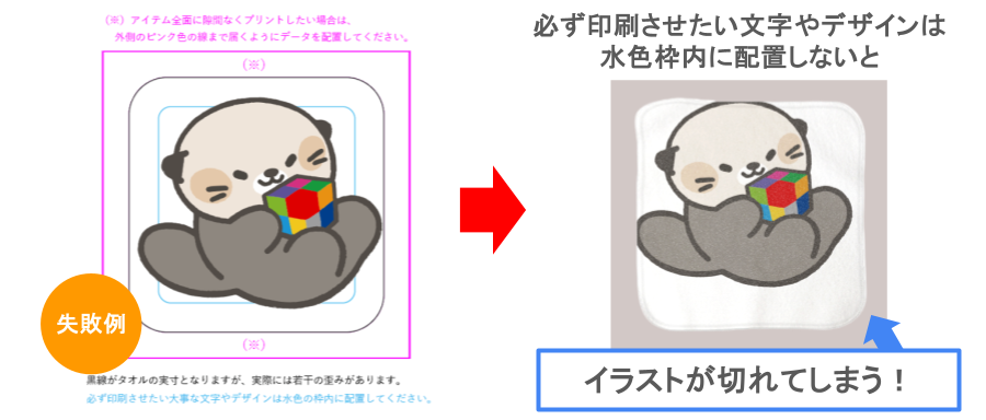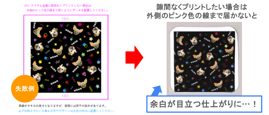 タオルのフチまでしっかりデザインを入れたい場合は、仕上がりサイズより少し外側までデザインを伸ばす「塗り足し」が必要です。