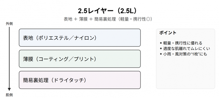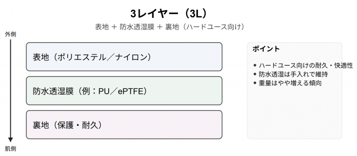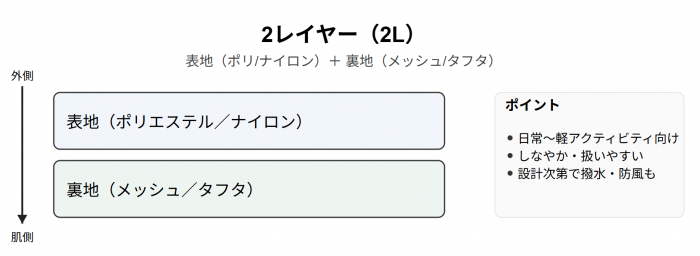 - A. 素材だけでは決まりません。膜(コーティング/ラミネート)+DWRなどの設計で性能が決まります。