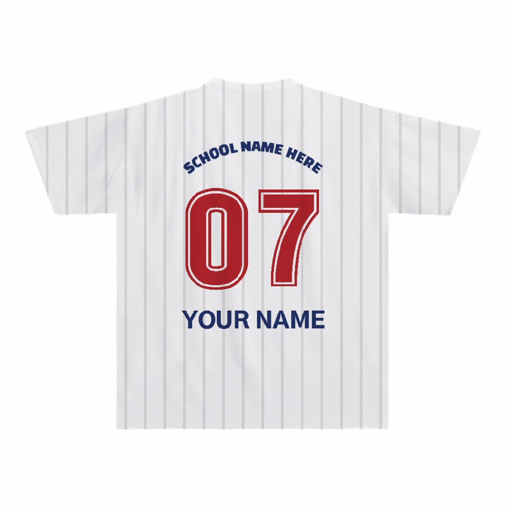 背番号や学校名を入れられるストライプ柄が入ったデザインテンプレートで、オールオーバー ドライTシャツをオリジナルプリントできます。色はチームカラーに変更することもできます。練習着にもオススメです。